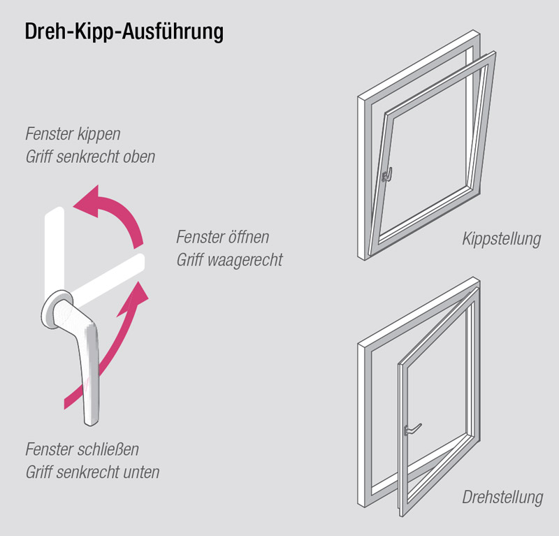 Wird der Fenstergriff bei bereits geöffnetem Fenster in die Kippstellung gebracht, löst sich der Flügel aus seiner Verriegelung. Gehen Sie bitte wie folgt vor: